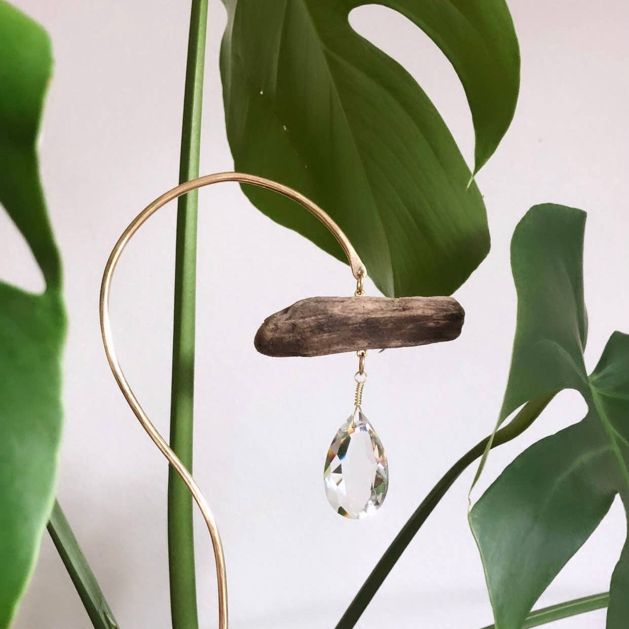 Artisan-crafted sun catcher made from thick, hand forged brass wire, sustainably sourced driftwood, and a vintage glass crystal. Made by a team of women artisans from hand-cut and hammered brass. Each piece is unique in its own way with slight inconsistencies, imperfections and the natural beauty of brass and driftwood.